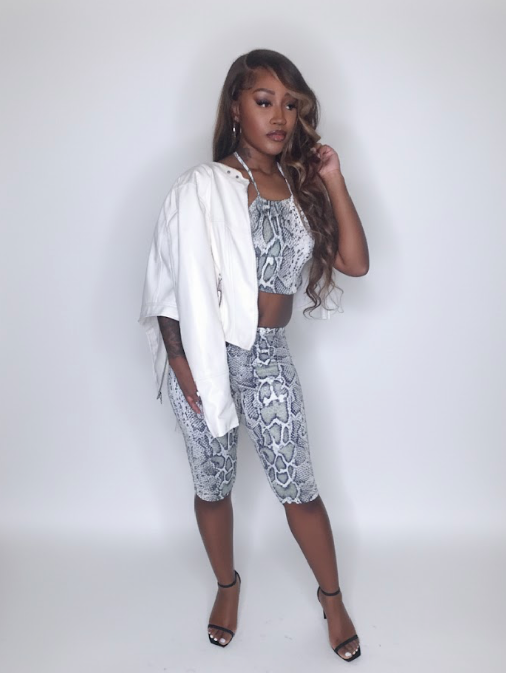 The THREAT 2 Piece set has the perfect touch of snake skin print illusions and the spandex fit to compliment every curve! For a sexy night out THREAT will turn heads